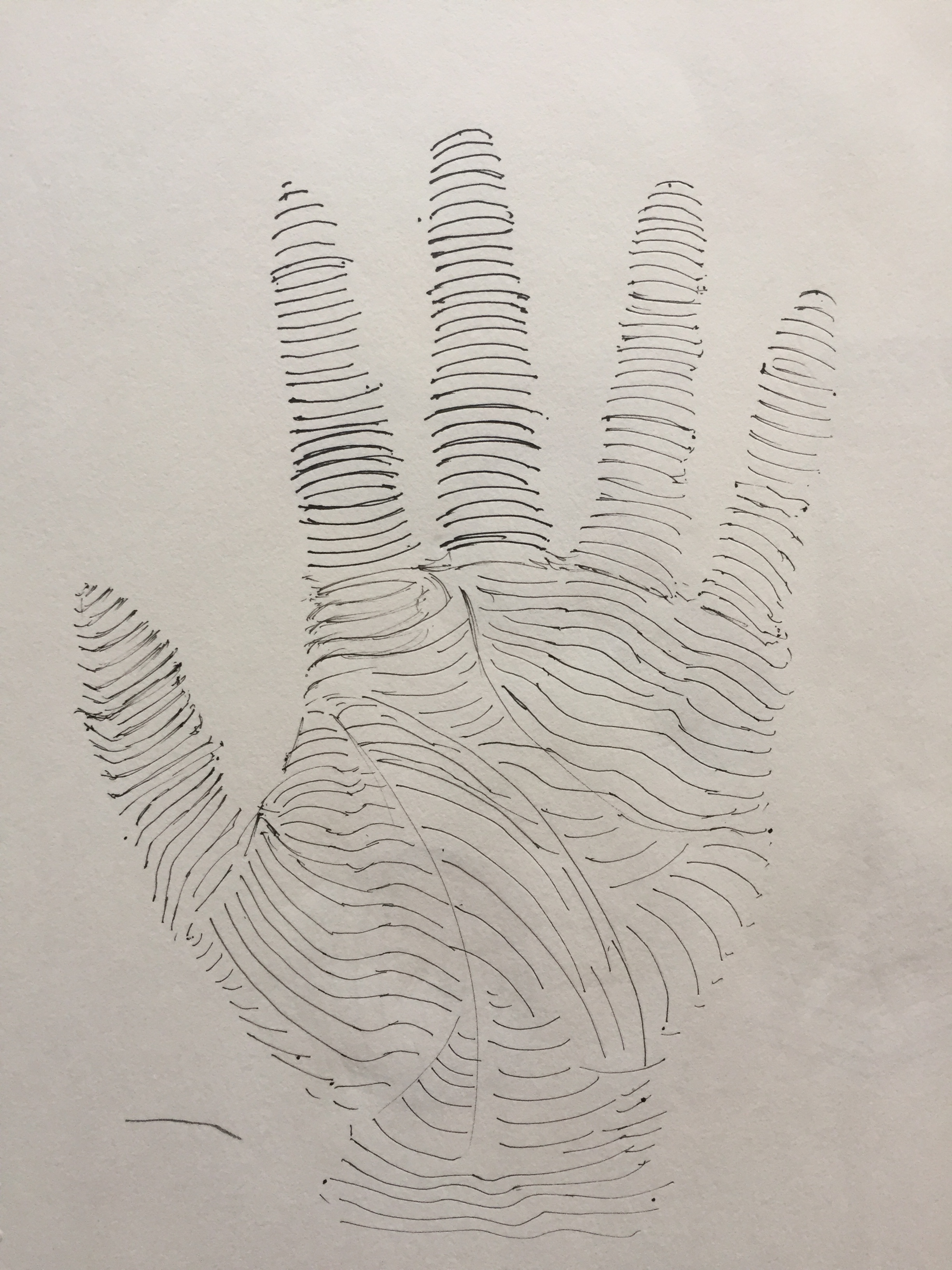 We started off by drawing our own hand,palm facing up,using only parallel lines.The condition given here was that we were forbidden from mapping an outline of our hand before beginning,and that we had to directly go in using a pen.This was quite a risky task ,since it forced us away from the comfort of a pencil and eraser,and made us estimate the proportions of our hand mentally. I placed dots to give me an idea of the dimensions of my hand,and began drawing the lines.This is what my attempt looked like: