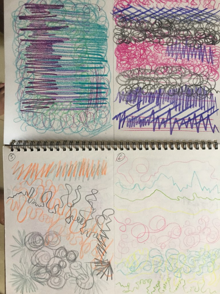 In the second half of the class,we had a fun activity planned for us.I was told to inform everyone to get a coloring medium and knew that music speakers were involved,but had no clue why.We were told that we had to listen to music and express how we feel in terms of color.This was truly enjoyable for me,as I went along with the rhythm of the music and filled up color on paper.It was also nice because the music played was great! Below are a few of my abstractions: