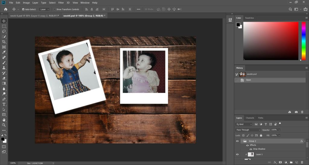 After this,we were informed about layers,their importance,and taught clipping masks.We also learnt about using drop shadow and how to create a polaroid effect using existing images.Clipping masks are a little difficult to understand at first but once we understood them as a ‘non destructive’ way of editing an image,wherein parts of the image were ‘hidden’ to modify it using layers,things made more sense to me.