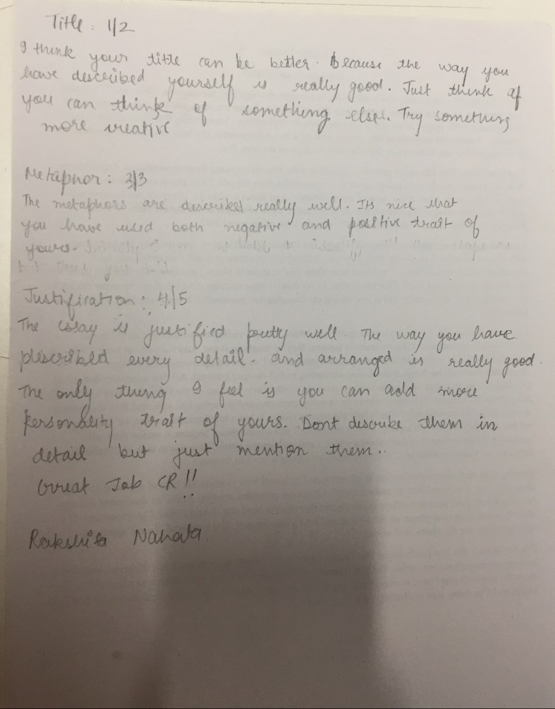 The faculty split us up into random groups of three and we were to review each other’s essays.My essay was to be reviewed by a classmate,Rakshita Nahata.Rakshita gave me an 8 out of 10 on my essay,and I was actually pleased by my score.This was the feedback she gave: