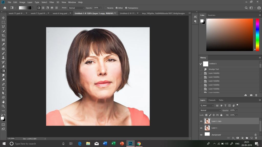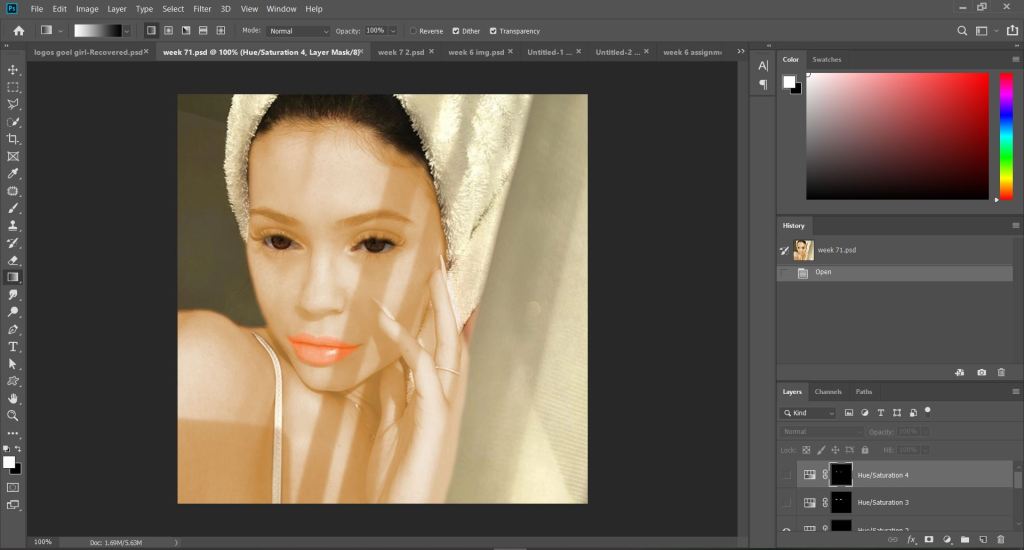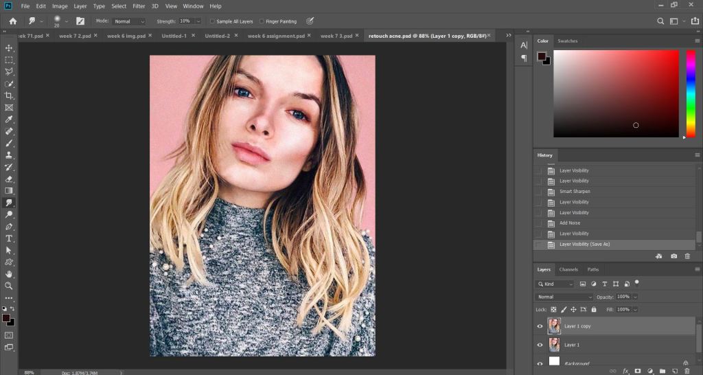 Next,we were taught how to fix acne using spot healing tool.I find these Photoshop features amazing,honestly.
