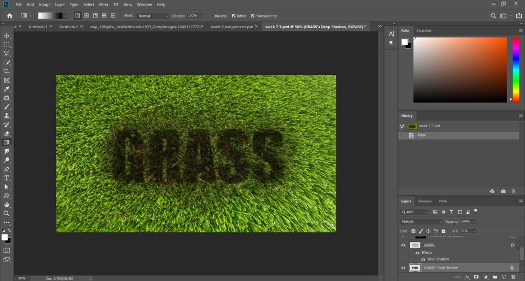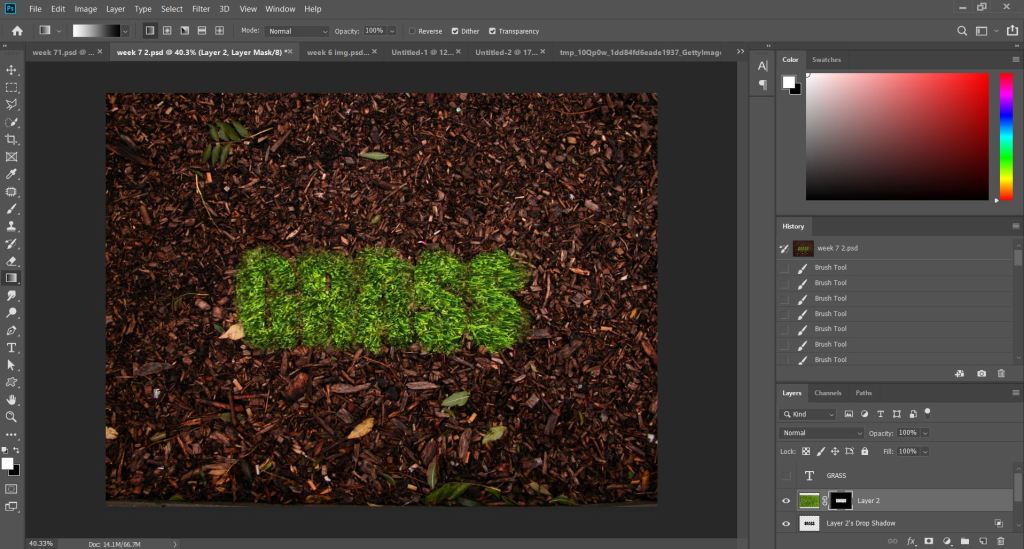 Today’s Imaging class was about learning how to retouch.But before that,we were given a small task to help brush up our masking skills.We were told to write the word “Grass” and use masking to create two different effects out of it.