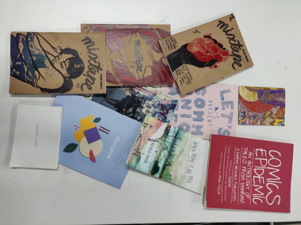 We were presented with Sir’s own personal collection of zines,ranging from community zines to individual concepts with a range of themes.My personal favourite remains a Zine which was a compilation of stories narrated by kids living in Dharavi,through broken and childlike illustrations.I thoroughly enjoyed the content.Personally,I do not like minimalist content which is ‘supposed’ to have a deep interpretation because I want to understand the meaning of what I read spontaneously.So I did not enjoy the aesthetic looking,poetic 4 sided zines as much as I enjoyed this thick zine filled with lively content.