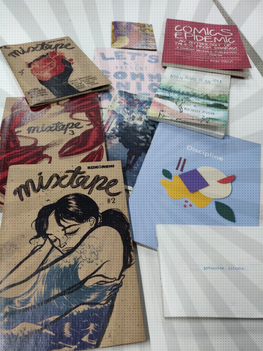 We were presented with Sir’s own personal collection of zines,ranging from community zines to individual concepts with a range of themes.My personal favourite remains a Zine which was a compilation of stories narrated by kids living in Dharavi,through broken and childlike illustrations.I thoroughly enjoyed the content.Personally,I do not like minimalist content which is ‘supposed’ to have a deep interpretation because I want to understand the meaning of what I read spontaneously.So I did not enjoy the aesthetic looking,poetic 4 sided zines as much as I enjoyed this thick zine filled with lively content.