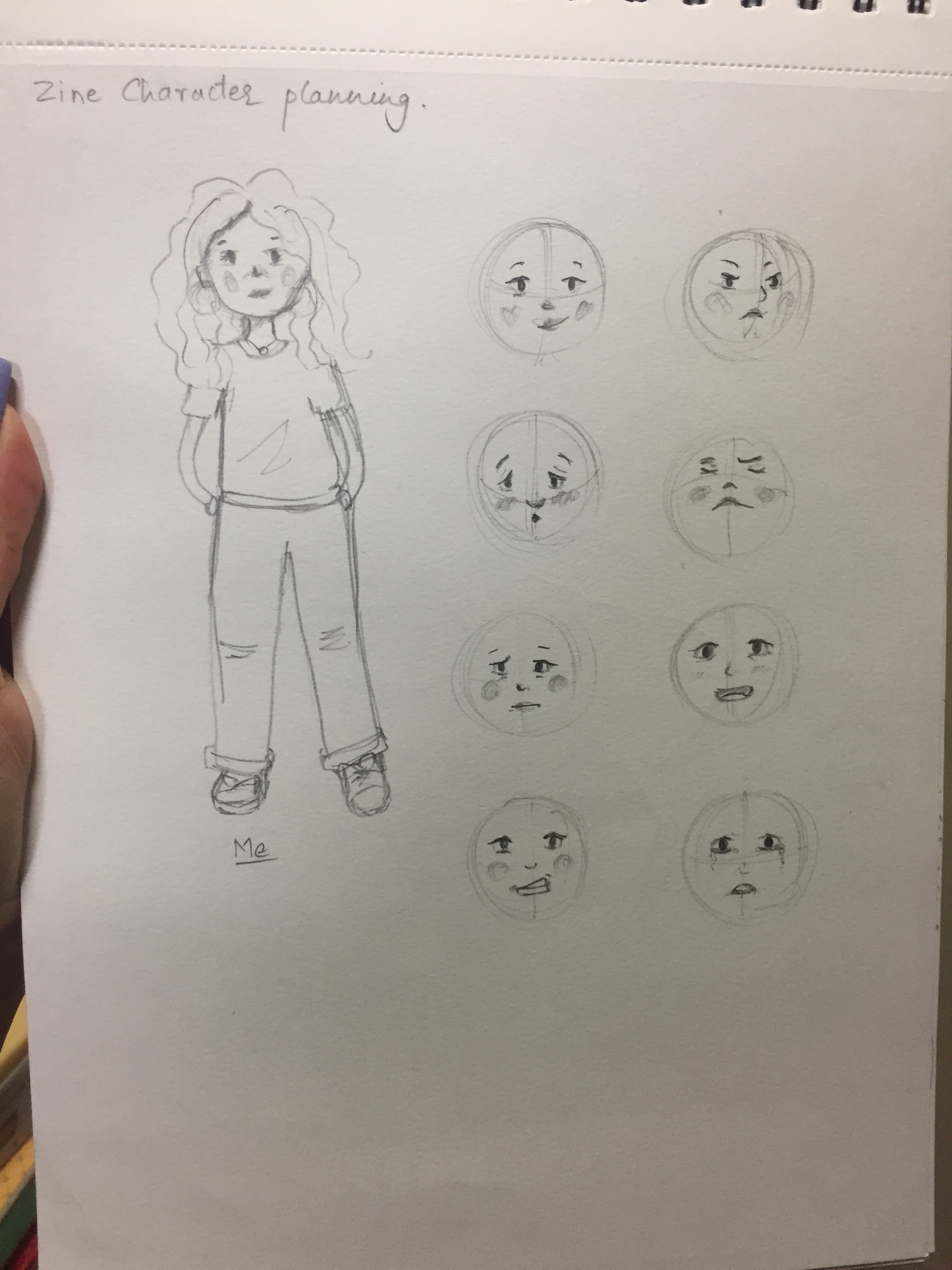 Lastly,and most importantly,we came to designing the character for our zine.As I’d previously decided,I wanted my character to look similar to me.I often wear a T-shirt and loose ripped jeans these days,so I implemented that in my character too. And I decided to keep the wild messy hair on my character too.