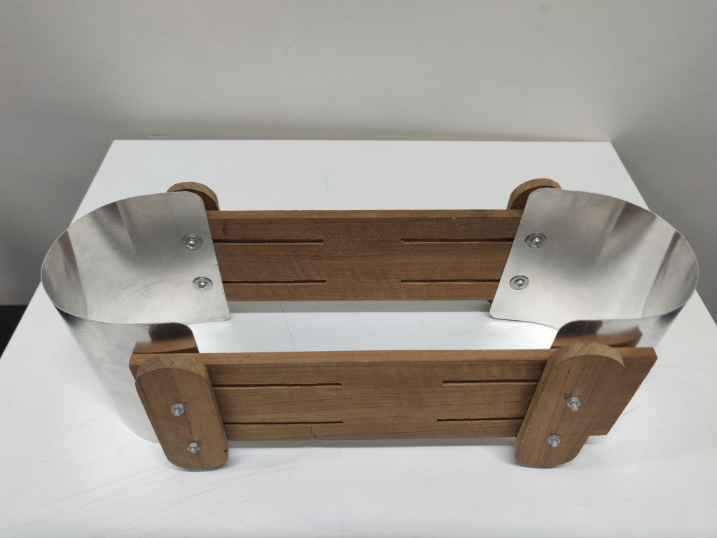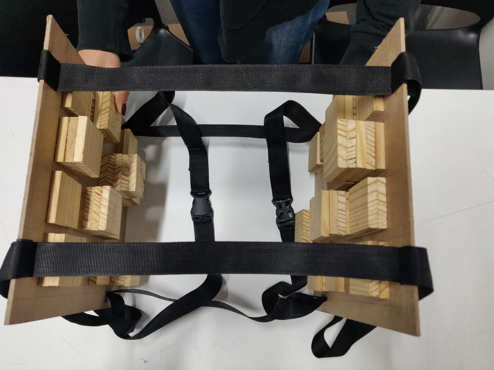 Our first final model is for our knee to knee action.The difference between the prototype and the final is the single groove in the prototype and two grooves in the final.This makes a huge difference,however,since the two grooves provide a lot of stability and prevents the sliding component from tilting.Other than that,we switched the MDF for teakwood,and the PVC pipe for a bent aluminium sheet. The two oval handles are meant for pulling by the other person to bring the knees together. The second final model is for the leg to leg interaction.We switched out the denim for the jute rope since it is much stronger and can support our weight better.We could not replace the PVC pipe used on the shoulder for support,so we kept it as it is.Although the model looks big,when the jute ropes are folded it fits the 1 ft size. This is the last model,for back to back.We made the prototype out of foam,but later replaced it with pine wood for the final,attached to an MDF base.We attached adjustable bag straps along the shoulders and our waist.We then tighten it after wearing,buckle it in place,and it prevents us from touching our backs together.This one is again teetering to cross the given restriction,but we have tried to keep it at 1ft.