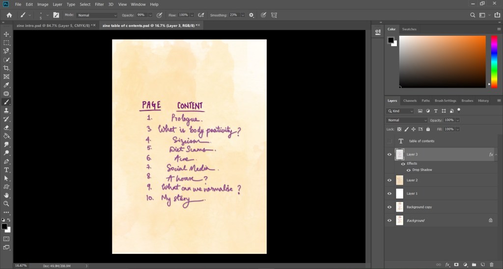 I feel like I’m still not well-versed with digital media and how the final outcome will look like,so I kept trying to be careful every step of the way.I made sure to find a store with a huge commercial scanner instead of the one attached to my printer,and this was actually a very important decision.I wanted to make an exact copy of my physical zine in the digital version,so I decided to use the scanned drawings,selecting and colour correcting them before I placed them on the canvas of my digital zine.