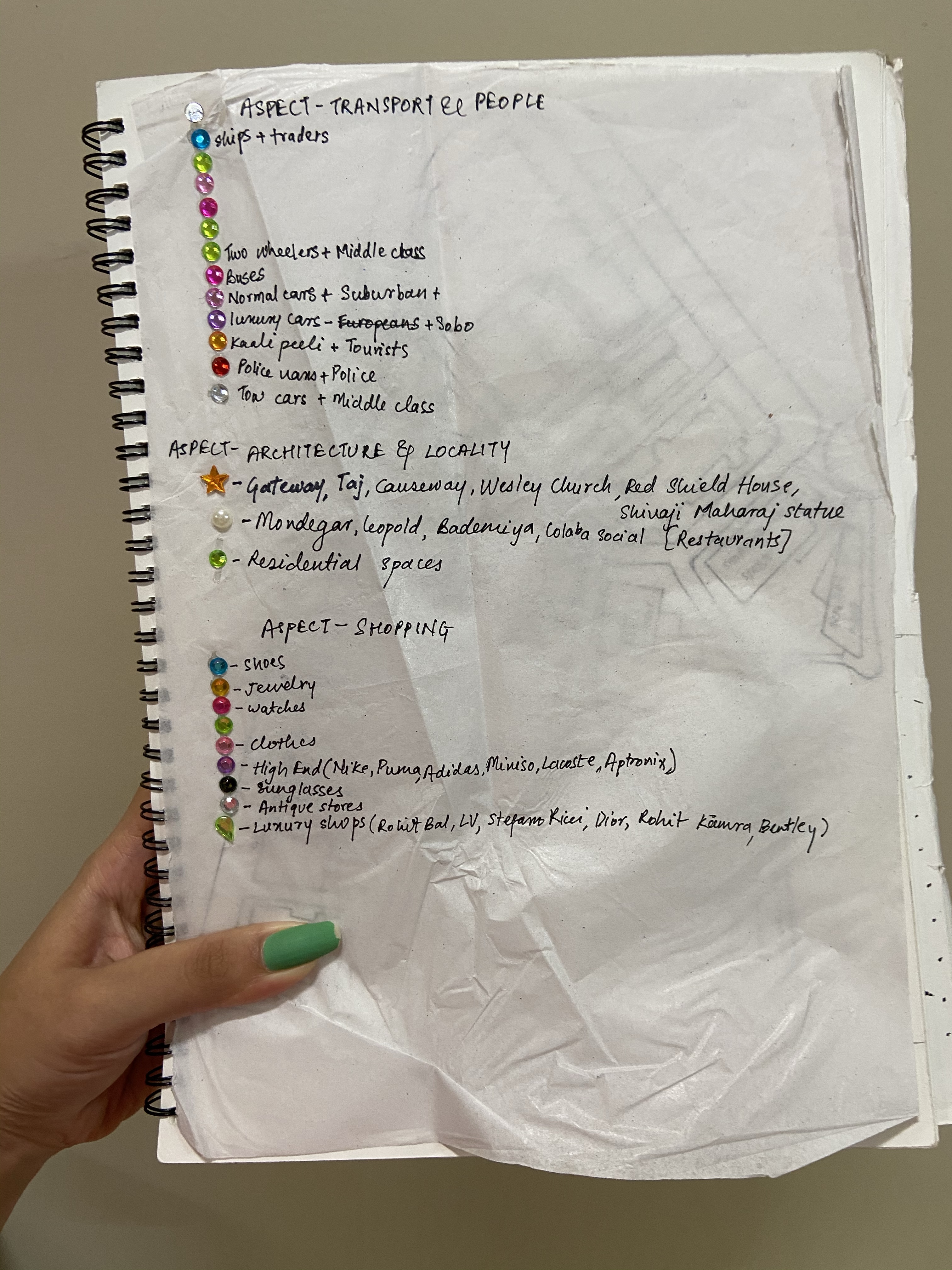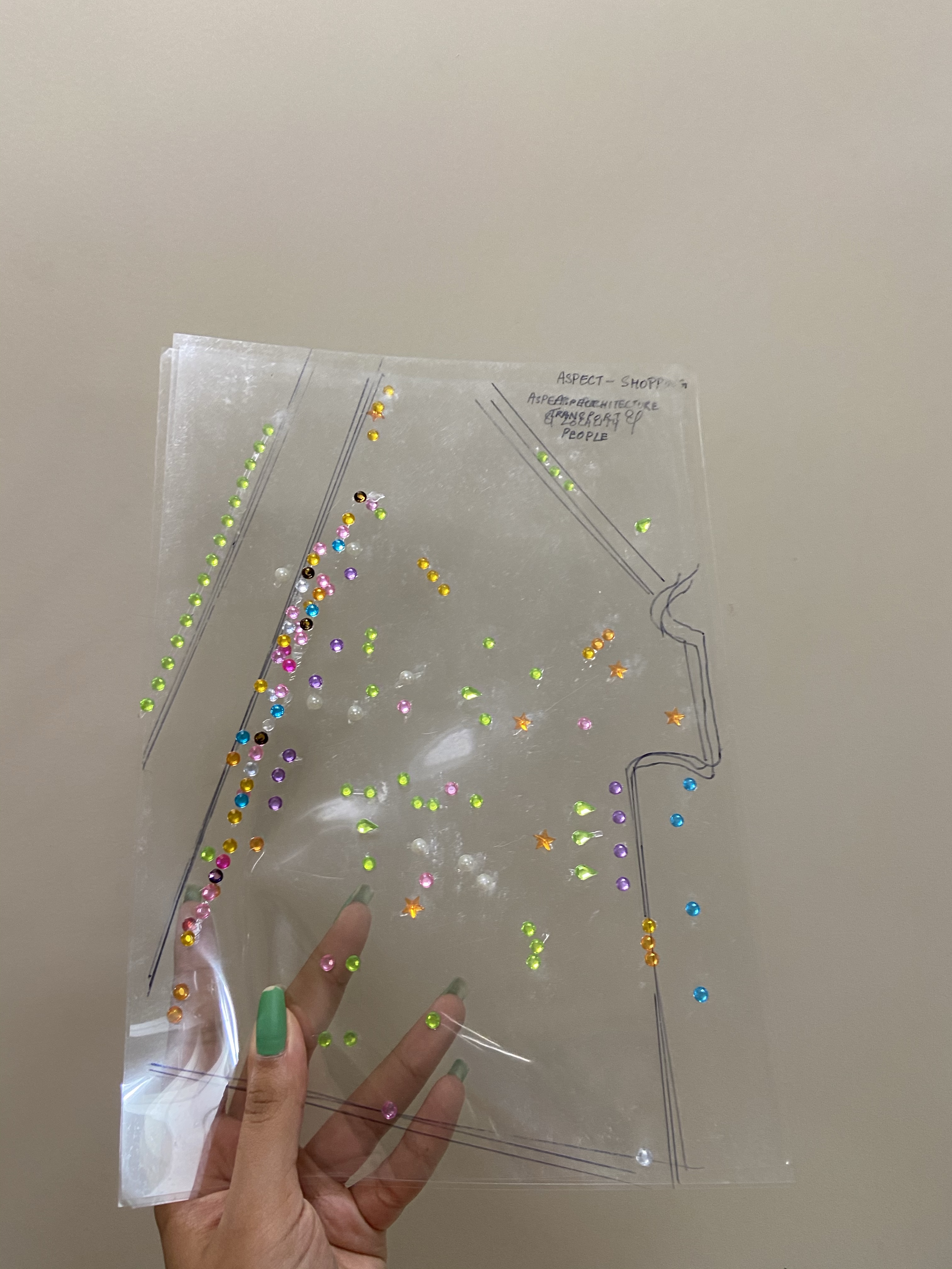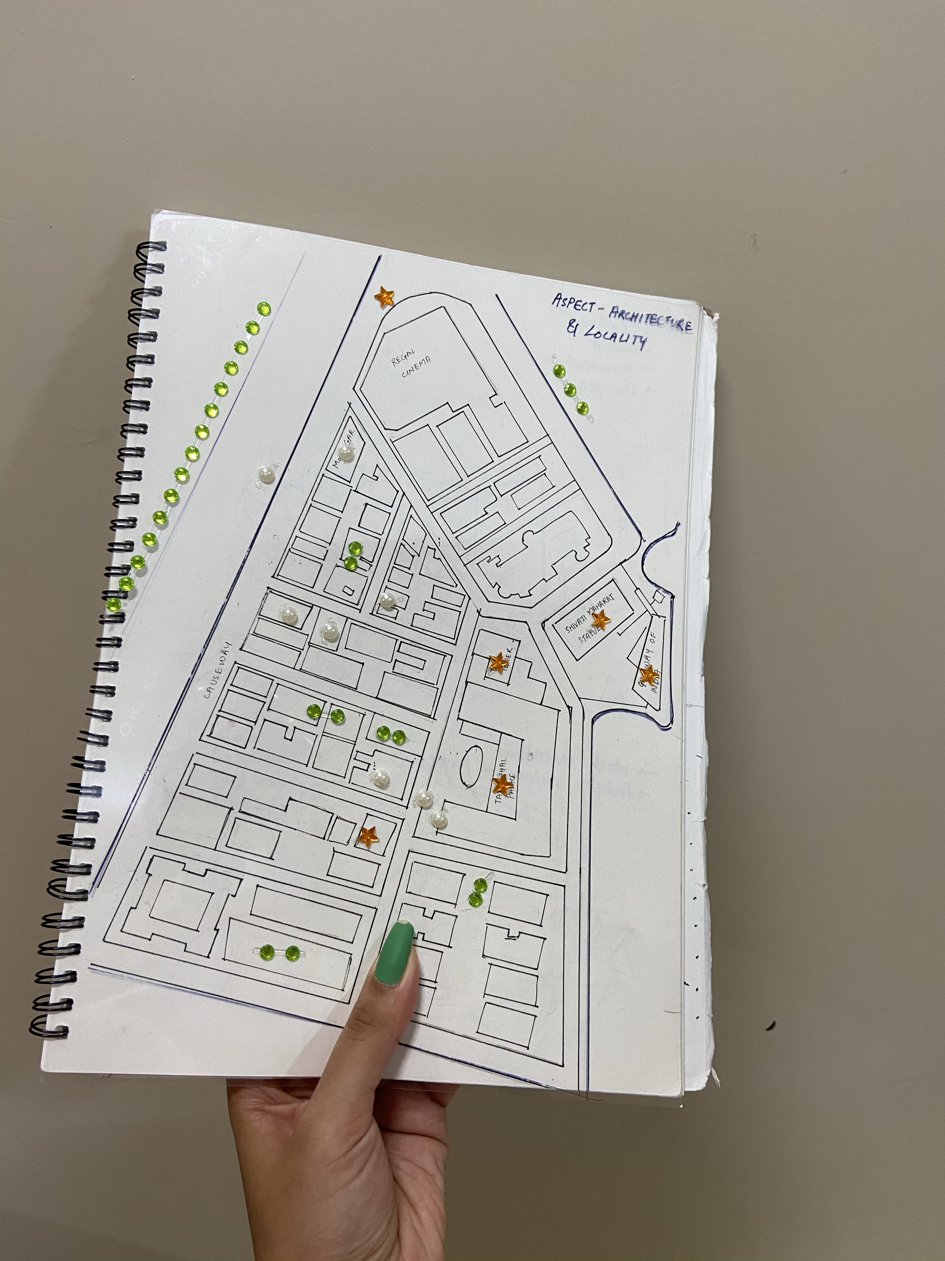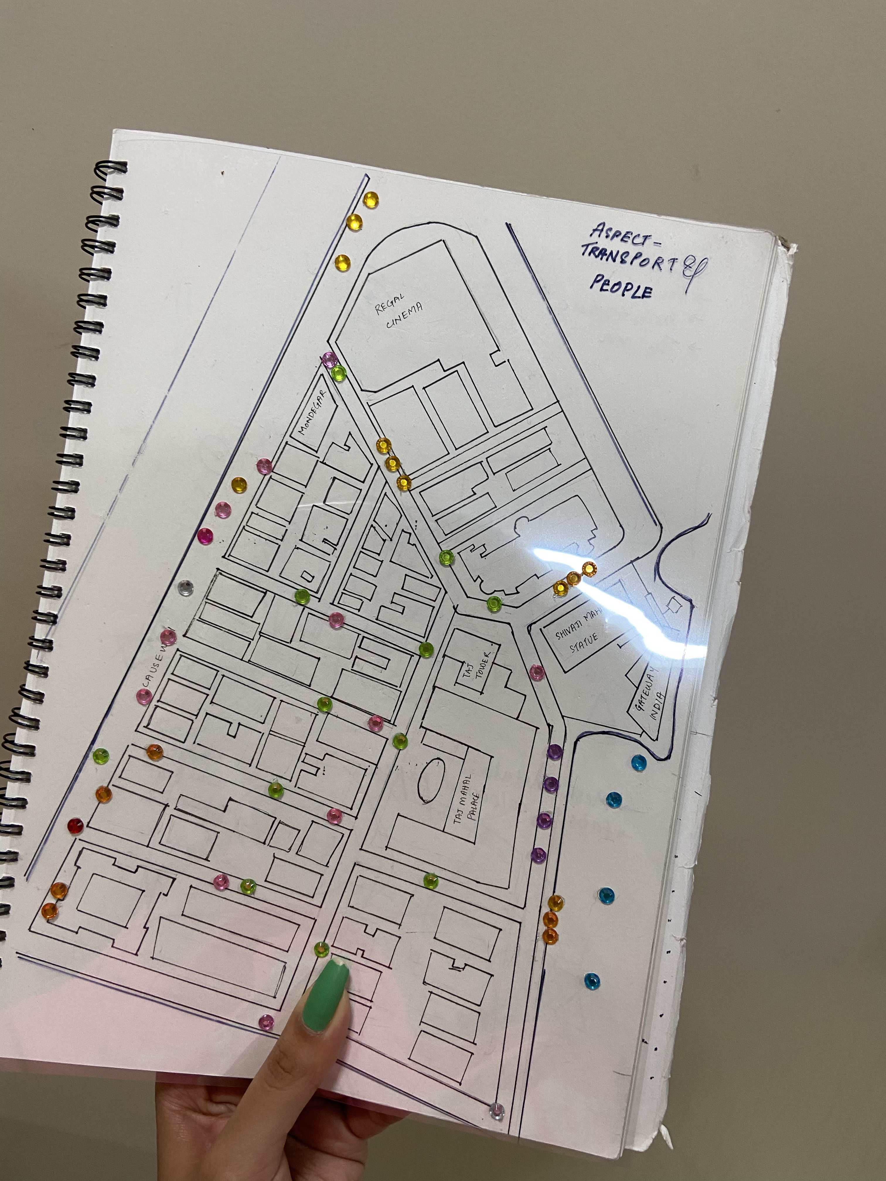 Instead of making different maps for each aspect,we came up with an idea which would be time-efficient and easy to understand. We drew our main map with references to the exact satellite images, and traced its outline on 3 clear OHP sheets. We purchased rhinestone stickers of different shapes ,and gave each colour/shape a legend,dividing them into their respective categories.