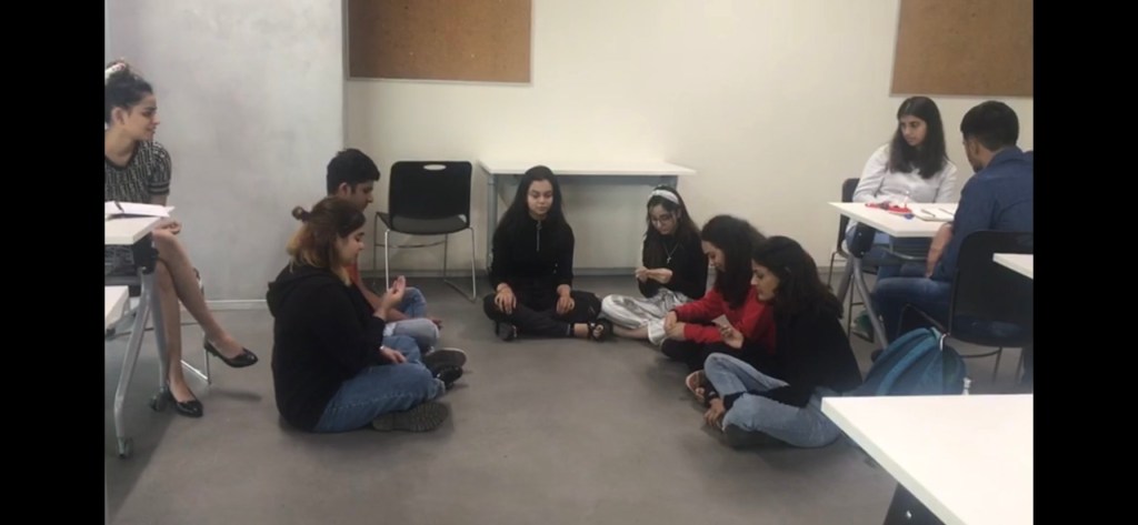 The second part of the class was to act out the word given to us as a mime skit.Given the vague nature of the word,we were quite clueless about what to do.But we still brainstormed and tried to make up something.