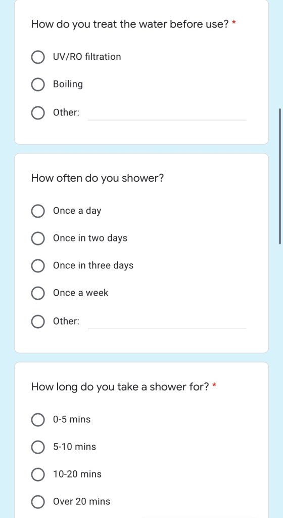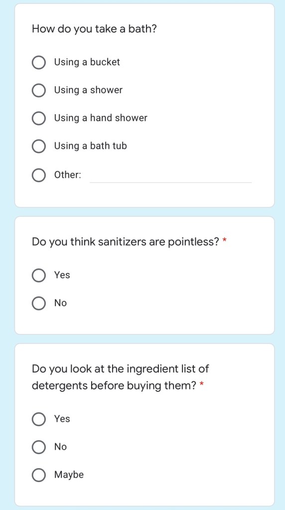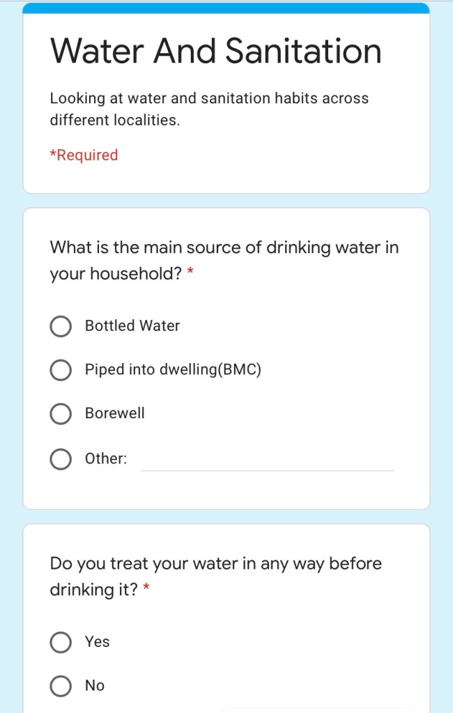 In last class, ma’am shortlisted a few of our questions to be asked around in our respective localities. So I made an MCQ-style Google form to make it easier for people around us to answer, and in some cases we went around and asked the questions physically, but entered details on behalf of the responder into the file. Below is our survey and response link: