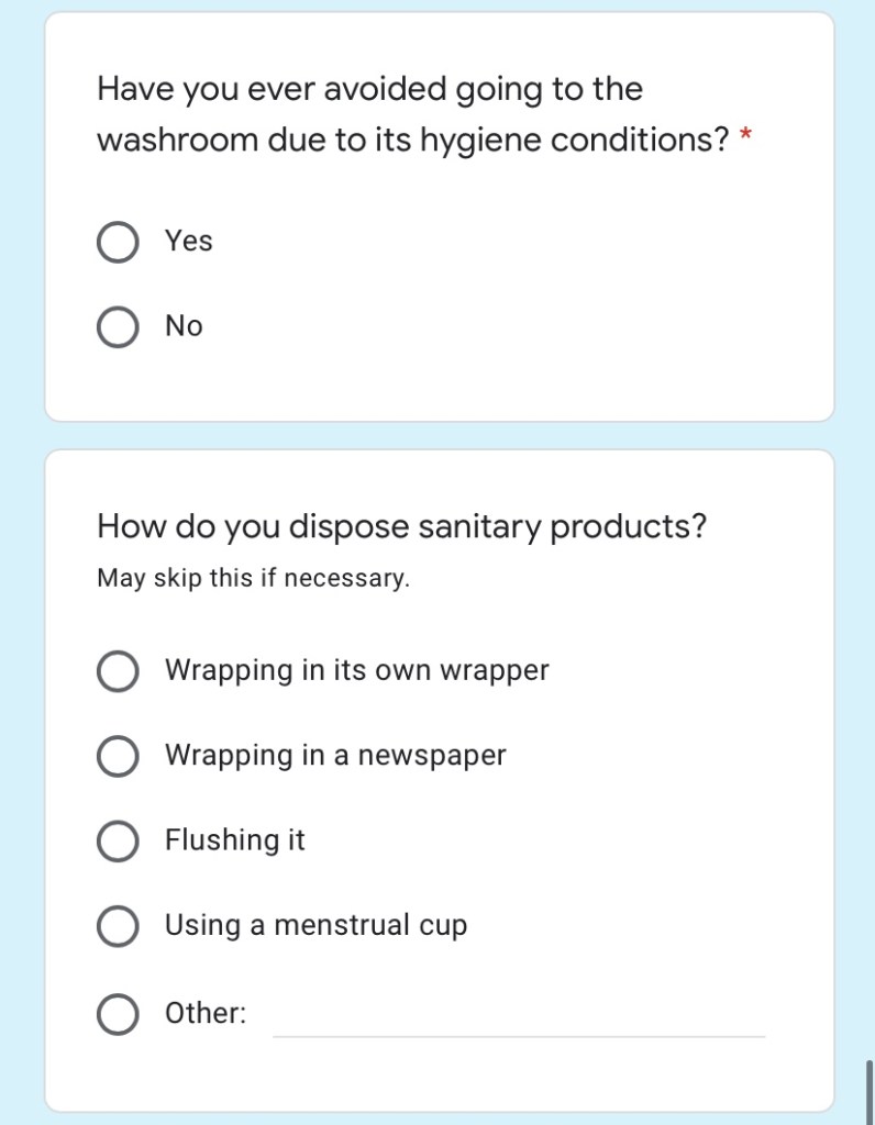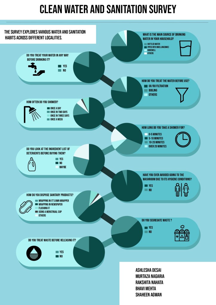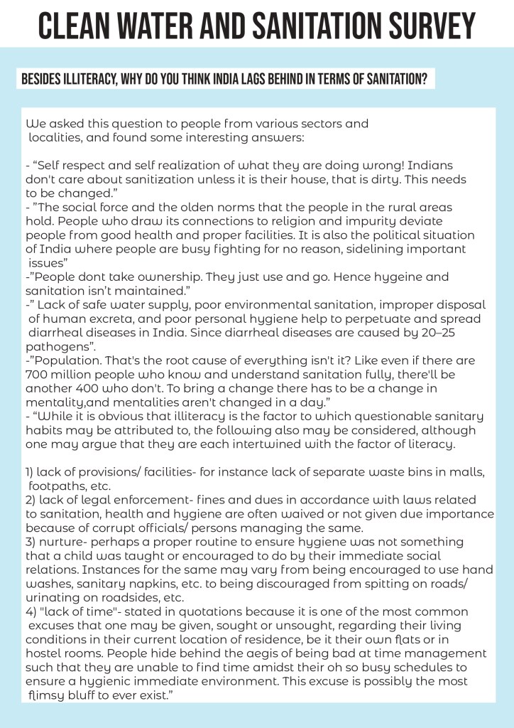 This survey was a real eye-opener for me. It only proved how many Indians are very well aware of how bad the situation is, and the overwhelming majority of those who have no clue about what’s going on. 95% of those who filled the form avoid going to washrooms and curb the urge simply because the washroom isn’t in the condition for them to use. And I being a girl, can obviously testify to this myself. 23 people who filled this form flush their sanitary products down the drain. The first thing written on the back of any sanitary product and in every public washroom is to avoid doing exactly that. But a lack of awareness about all these basic facts harms both, our bodies, and the environment around us. I saw entries of people not showering as often as needed, people not knowing whether they’re drinking filtered water, and avoiding segregation of waste in their houses. And they’re probably my age, living in a similar environment like I do. So I learnt a lot from the data that these responses gave me. I hope filling the questionnaire itself made the responder a little more of an aware citizen too.