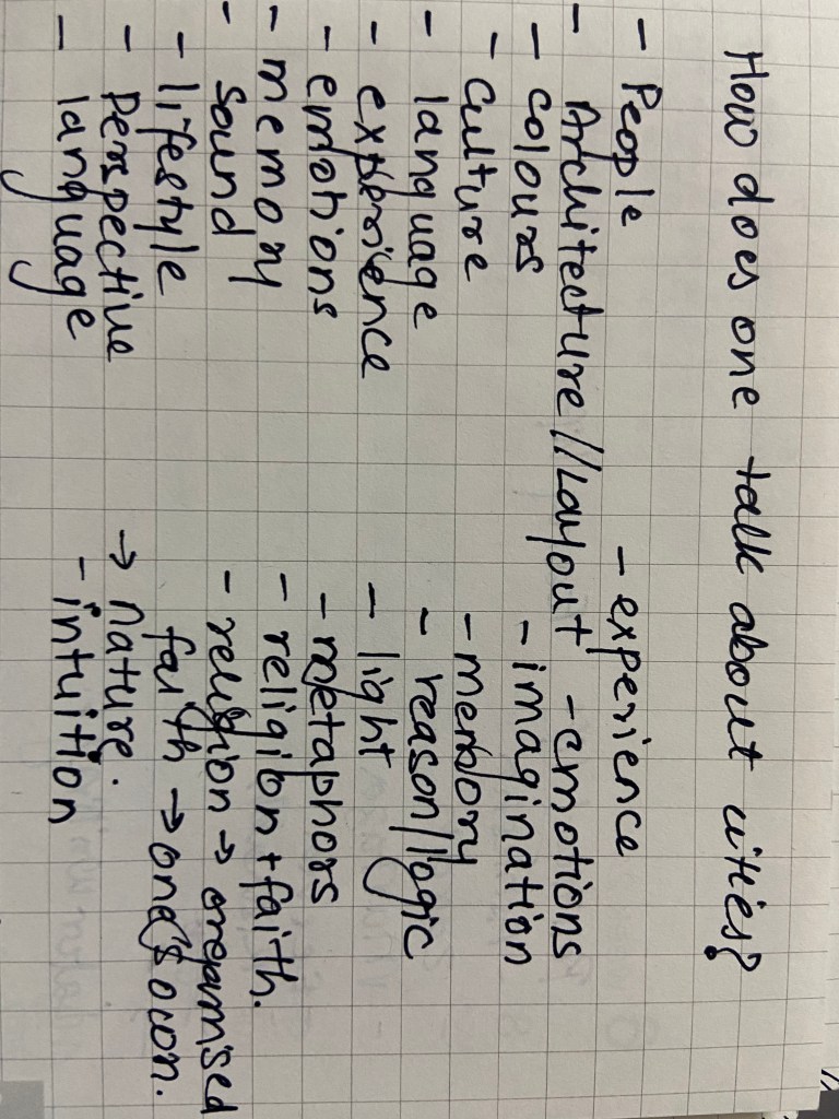 We were asked the question,” How does one talk about cities?” . The first thing that comes to my mind when I think of any city is probably the ambience that’s stuck in my head with respect to that particular location. For example, if someone says Jaipur, I immediately think of a grainy saturated filter with a pink undertone washed over some gorgeous ancient architecture. Besides this initial thought, I also connect cities with the emotions and memories attached to that place. After all these experiences come to mind, I put all the physical aspects like food, buildings, climate,etc into place.Below is a compilation of all the words we could come up with in class when asked this question:
