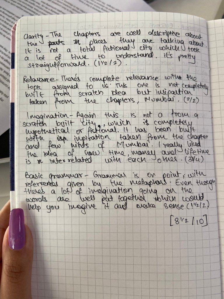 I was told to firstly complete the book. As I am now reading, I realize why I was told to do so.I hadn’t read enough of it to explore all the different kind of elements I could still add. I was told to try and change the third person narrative to first person. Maybe the conversational tone of the chapters is unnecessary and creating confusion. Its leading to me telling the audience what my city looks like,instead of showing them.I also had to think of certain intangible elements that I could add to the cities. And finally, I was told to rethink the chapter names.
