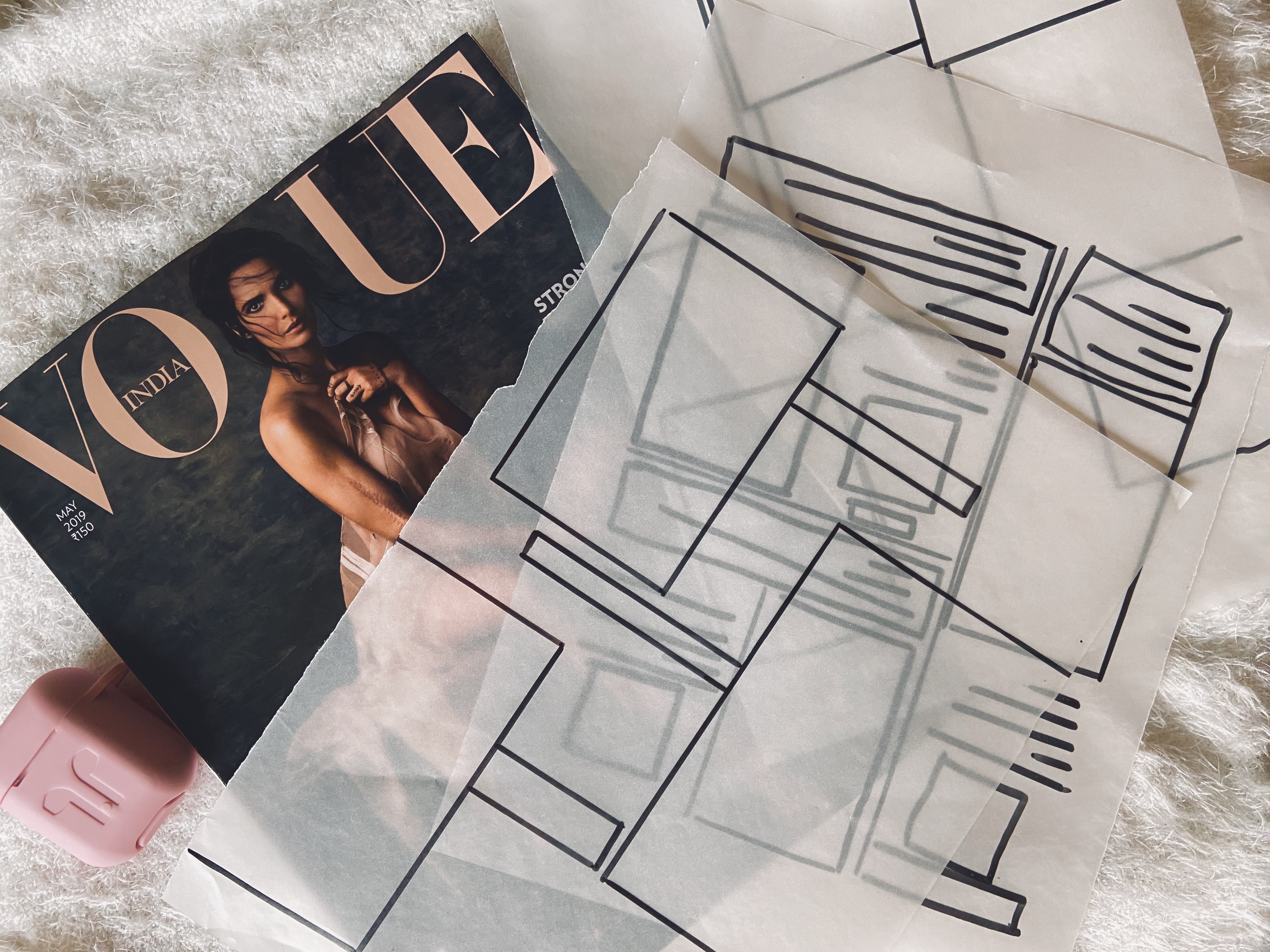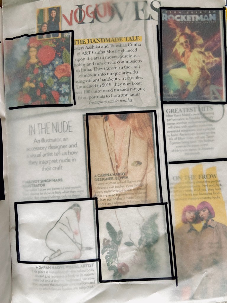 This week we were told to get magazines to class. So I found my magazine stock, and took those with the classic ‘glossy magazine’ layouts, along with some tracing sheets. Our exercise was to find pages in these magazines, figure out how many columns it had, and trace the layouts. This helped me understand how magazine formats worked. Initially, I had no clue what was going on and how many columns each page had. But if you superimpose the 6 column Indesign grid on any of the pages. it soon becomes clear which format the page is following.