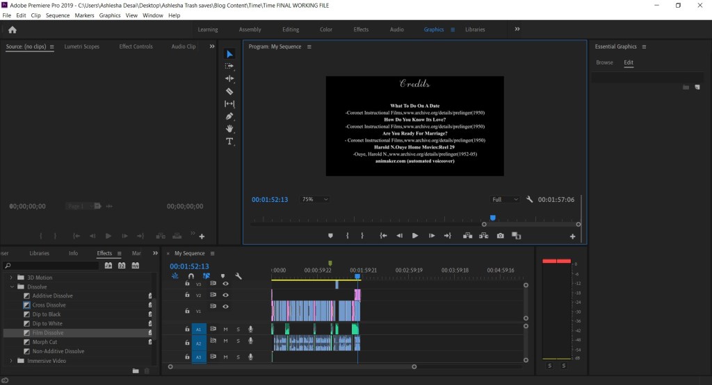 This class was about adding credits and deciding the title for my video. I already had some perfect credit music in the end, accompanied by a ‘The End’ frame. But as I mentioned in the last blog, my video runs 1:58 minutes long, so I had to choose between a still credit frame and the ‘The End’ sequence, and a rolling credit clip without the end frame. I chose the latter since I thought that credits gradually rolling across the screen would look a lot better.