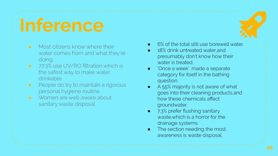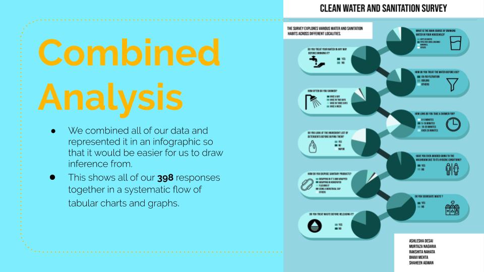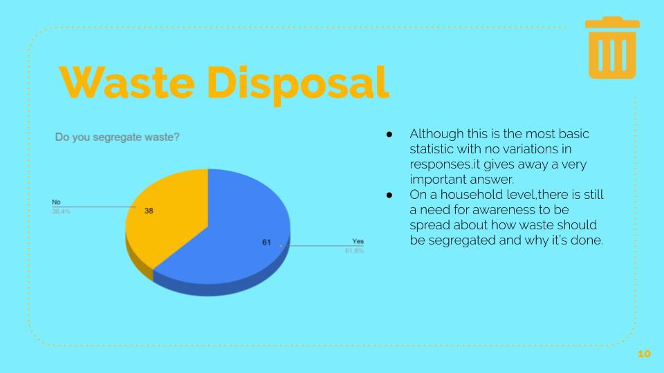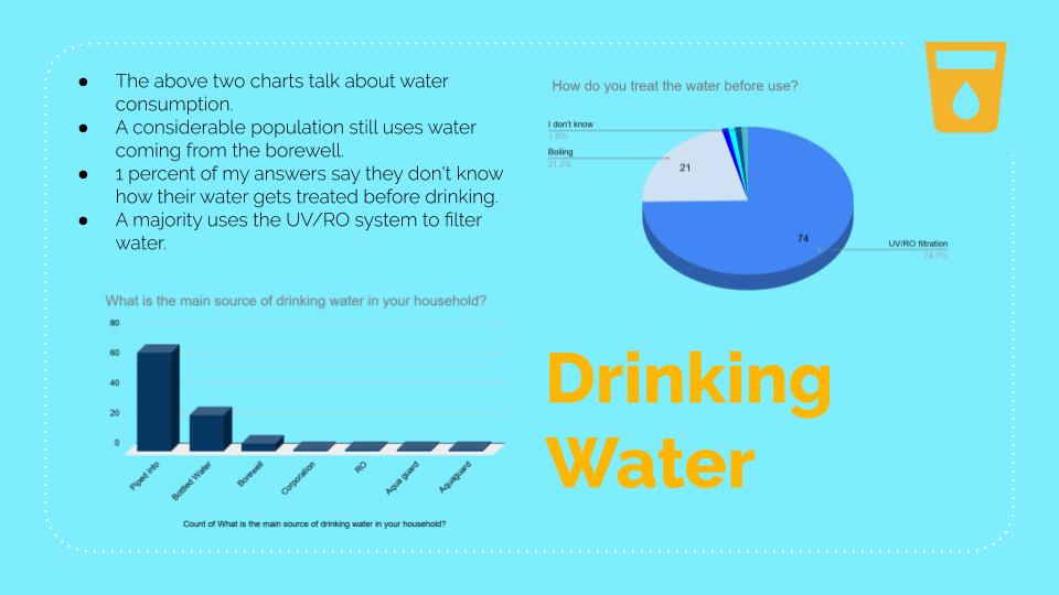 Through the presentation, I understood how to present a lot of data in a simplified way. I also used Google Slides for the first time instead of Microsoft Powerpoint, and it helped me and my group work on the same document simultaneously, thus making it very efficient. We were all just a call away and gave each other notes and advice live as everyone worked. This was very new and fun because usually people have to wait for someone to send powerpoint slides to them and then edit them again together to make it look like a single presentation. Here the theme was selected beforehand, and this made everything much easier. Also, I could import statistic graphs directly from my Google Forms/Sheets, so that was a great thing too. I learnt how to work around a group and complete things together on time.I did not know how much more of an impact a pie chart could make in a presentation. I really started to get the hang of data and how to analyse it to draw up a conclusion.