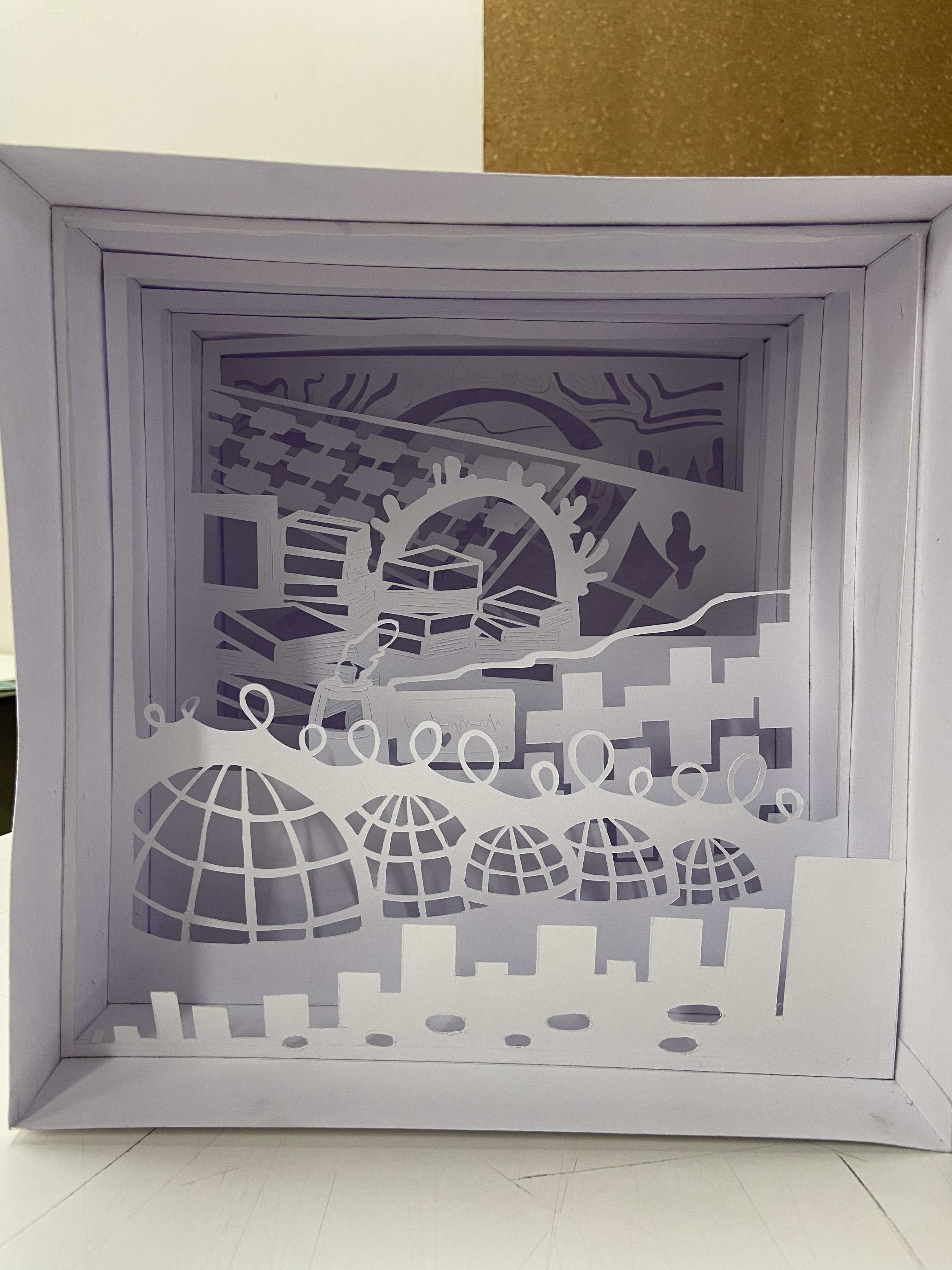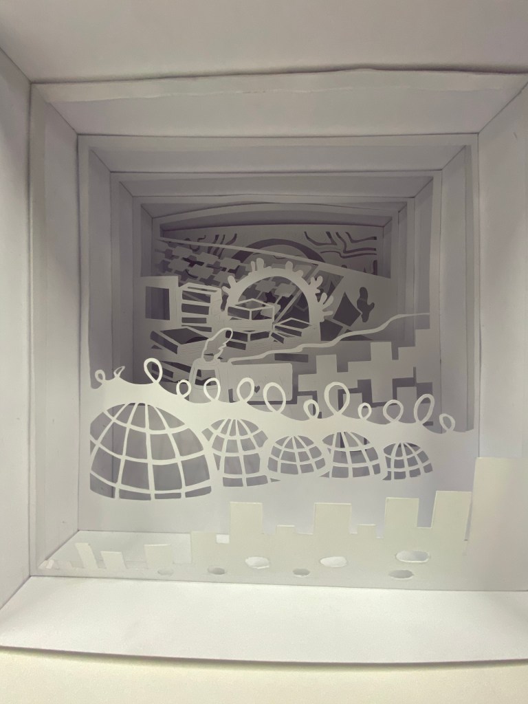 Today was the review day for our final tunnel boxes. I was the first guinea pig to go up and present my work. I was nervous because I definitely knew it was wrong, but still decided to give it a confident try. I began by showing all my iterations one by one, talking about the thought that went behind each of them, what worked and what didn’t. As I proceeded to the layers of my city however, I soon began explaining things in specific sections, which was a mistake on my part, since it began sounding less and less cohesive as I went on. So the feedback I received was that I should’ve developed my concept better, and stuck to the one-metaphor city ( for example, books or glass) for the final model. I knew that the damage had been done already, and I understood that I can’t afford to get too attached to my project all the time, and definitely not enough to get carried away into doing whatever I want.