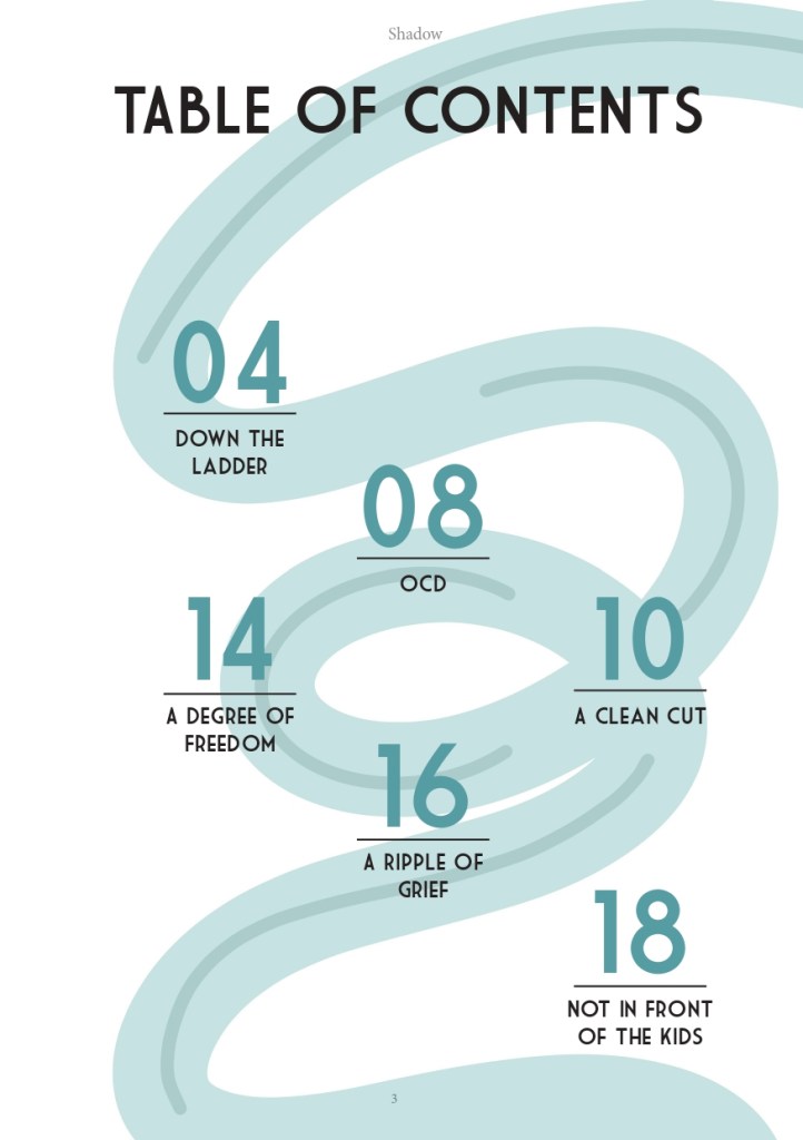 Initially I’d created a standard ‘table’ of contents, but then I thought, as long as the reader knows where a chapter begins, why should the the format bother? So I made a random whimsical line along a page, and placed page numbers in bold on that with the chapter names. This then became my absolute favourite page, besides the cover, of course.