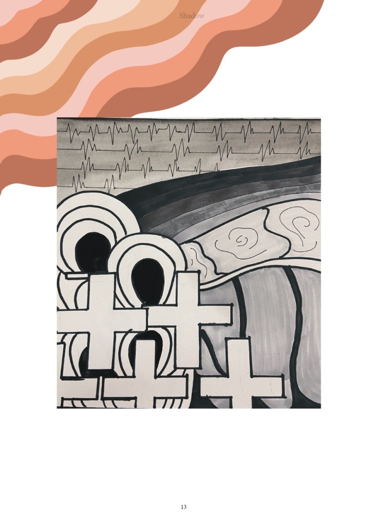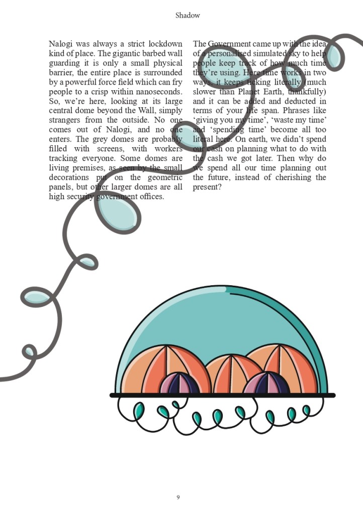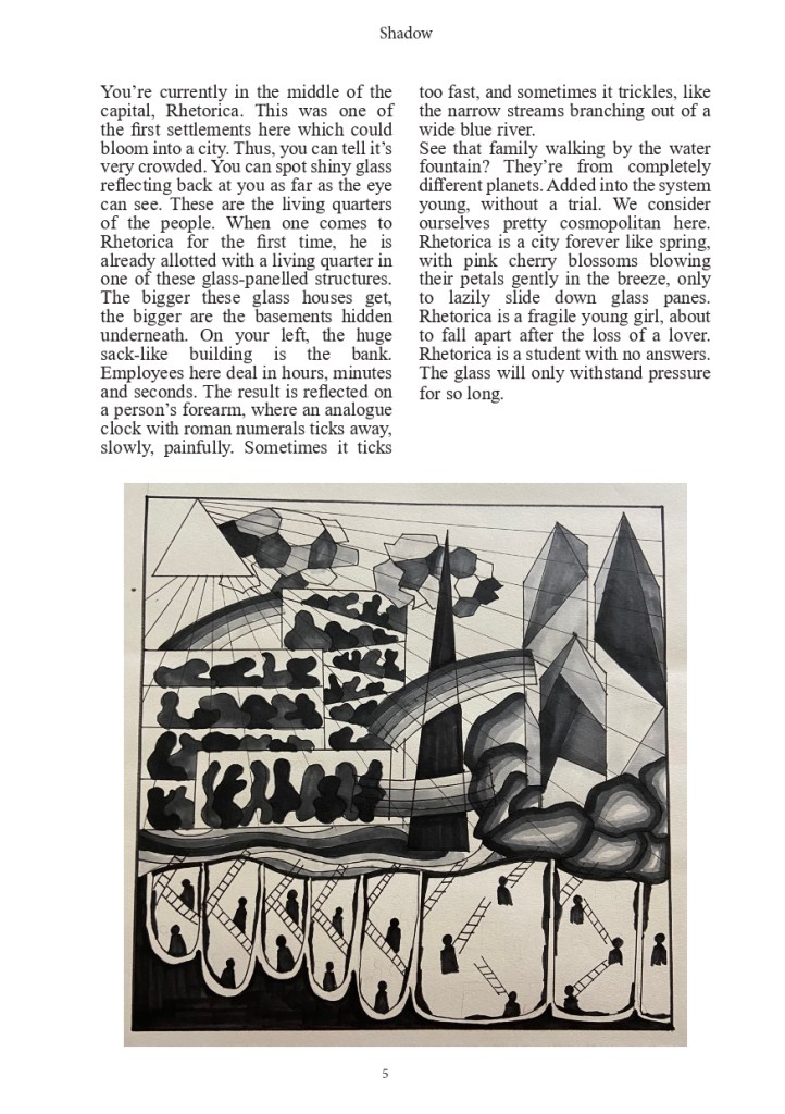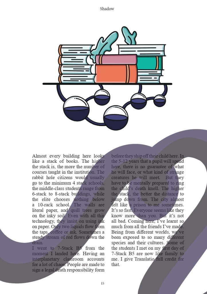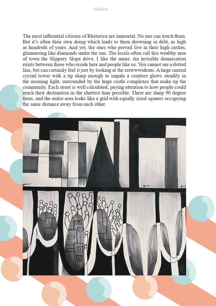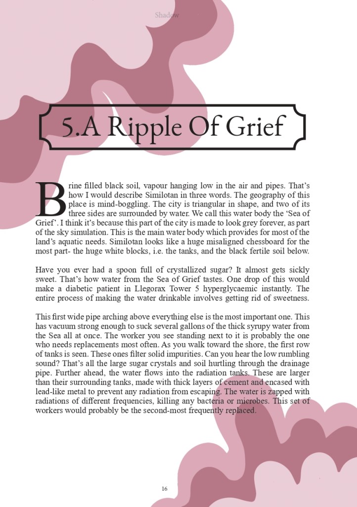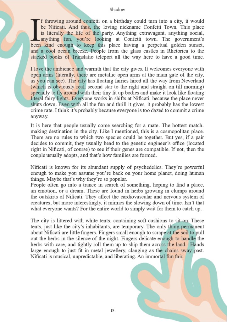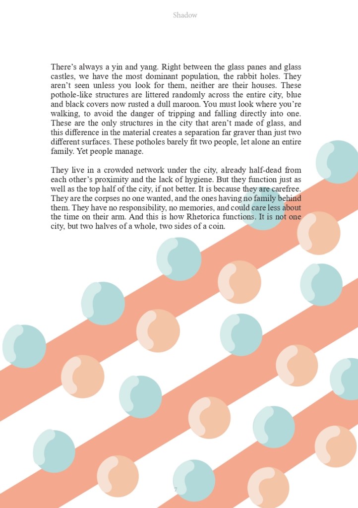 My next addition was for adding some colour in the background, since my pages are all white. I added some patterns in a low opacity behind the text, and these were copied and reflected onto facing pages so that it looked like the illustration was connected between two facing pages when a spread was opened. I had a lot of fun with these patterns, and these each represent some element of the city that I am talking about, so it amped up how every chapter looked.I took care to export these as transparent PNG layers, which made life easier when it came to arranging it behind the text.