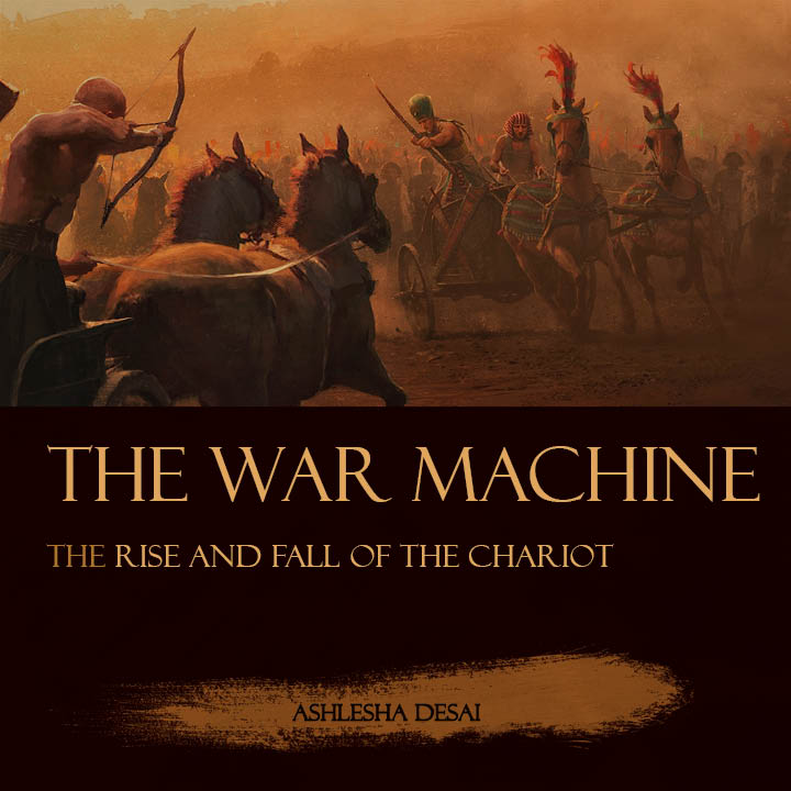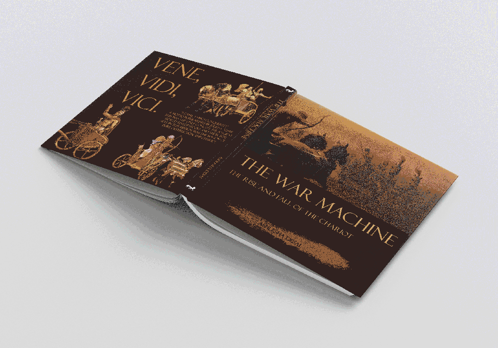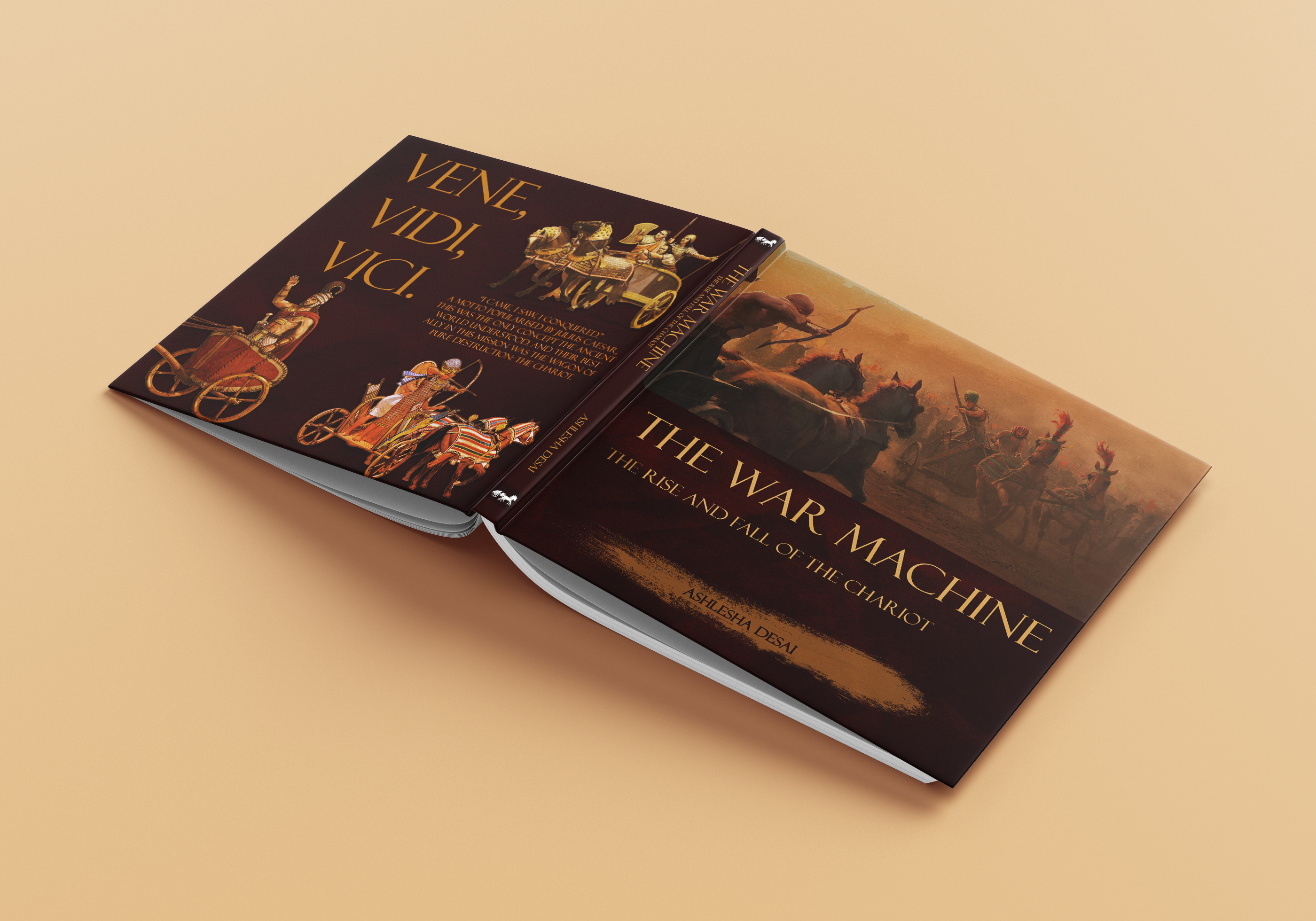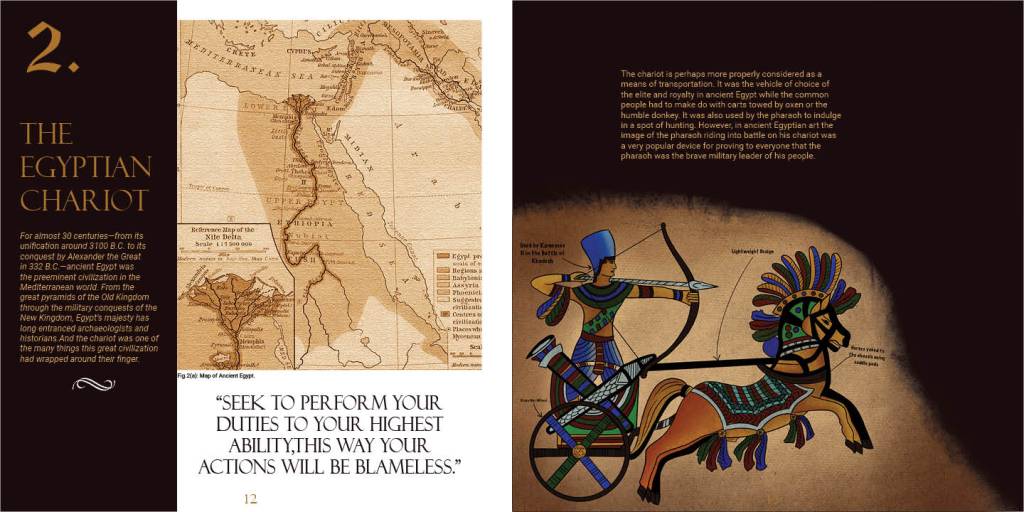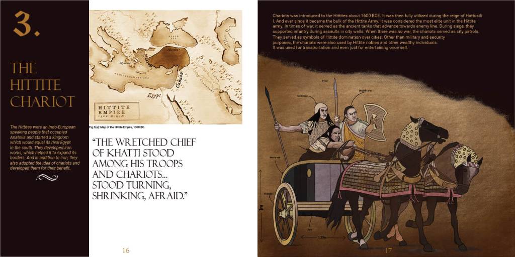 As for the cover page, I was in the hunt of an illustration or some graphic that encapsulated the drama and wrath that chariots brought in with themselves. Luckily, I found an exquisite concept art online, showcasing the battle of Kadesh, the greatest example of the wrath of the chariot. For the back page, I masked a few chariot illustrations and placed them, covering the rest of the space with a quote.