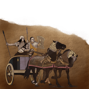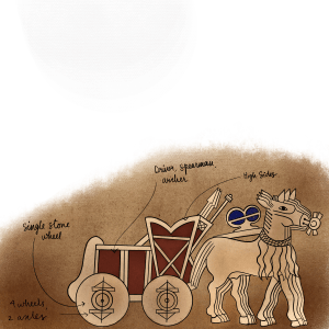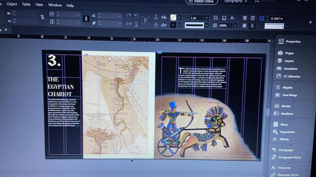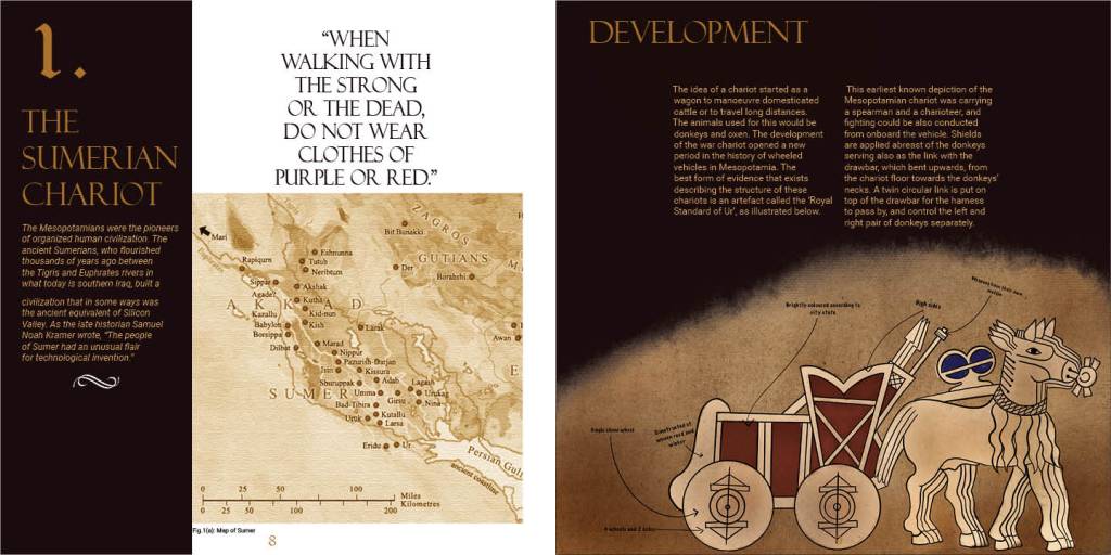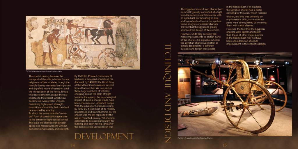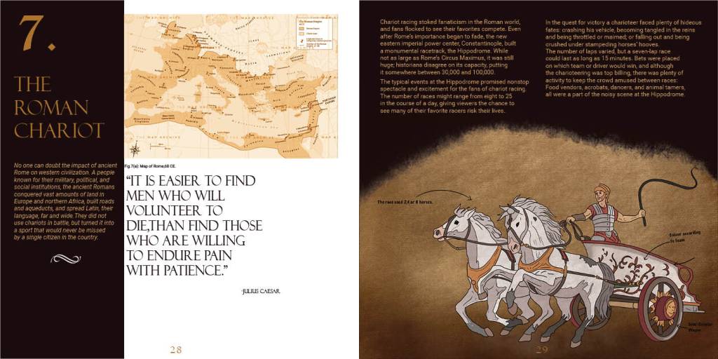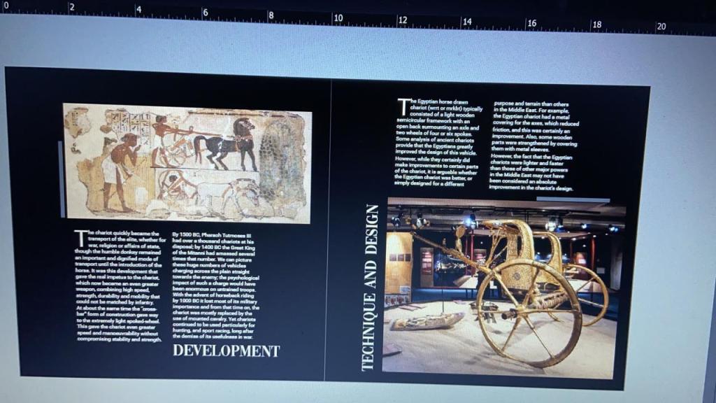 I labeled each of these chariots with their significant features, and had a distressed paper background which was beige or brown, to give the paper an old texture effect. I placed these chariot illustrations on the right side of my spread. This right spread placing ensured that everything looked emphasized even when the reader flipped through the pages. These illustrations themselves took up a lot of my time, more time than it took to set up the layout of the booklet.