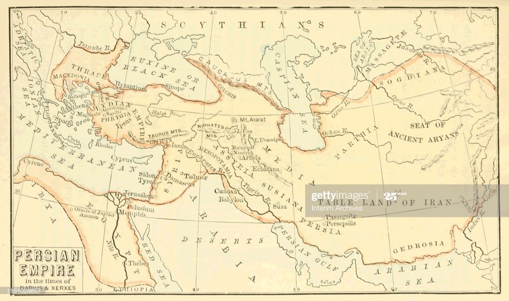 Map, entitled ‘Persian Empire in the Time of Darius and Xerxes,’ shows territories in Asia and the Middle East, 330s. It appeared in John Quackenbos’ book ‘Illustrated School History Of The World,’ originally published in 1876 (and updated several times afterwards). (Photo by Interim Archives/Getty Images)