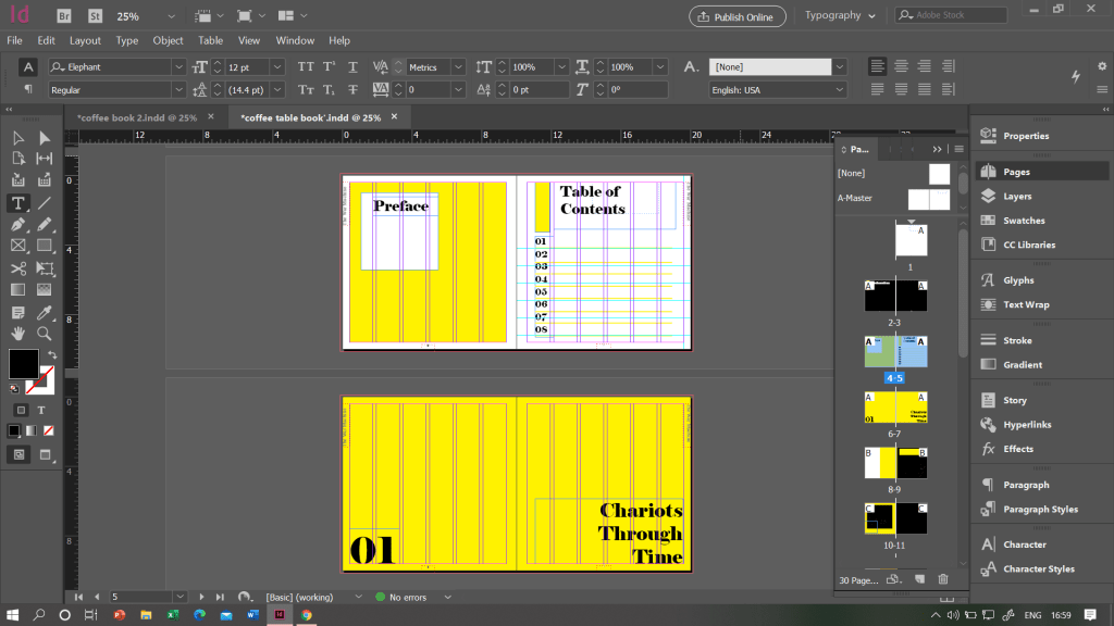 My last master page was white on the left and black on the right. I used this spread for pages like declaration, table of contents, and preface. I then set up the layout, adding in content that I had already kept ready on Microsoft Word. In every section header, I used Old English MT for the numbers of the spread; I used Didot for the main chariot titles, and a small description below the title included an overview of the civilisation mentioned, which was written in Roboto Italic.
