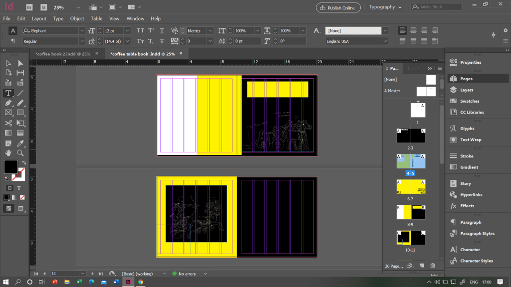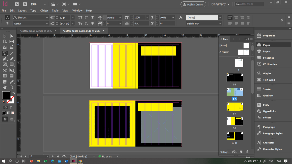Starting off, I want to make clear; I did not like InDesign very much initially. This is because I always thought InDesign is a very restrictive software and thus I had to listen to the software before it could listen to me. When I was told about the project brief, and making a whole 30 page long booklet in this software, it worried me. I started by looking through some different styles of coffee books. The one thing that I noticed in all of them was that there was very sparse text. Most of these books were covered in photographs arranged in different layouts. They even arranged some of them were even in the same layout throughout the book. The intent of these books was to give this photo is the chance to take the spotlight, and display them. So I understood that I had to keep the text as limited as possible. I also realised that the best way to allow these photos to shine through would be to have a dark background.