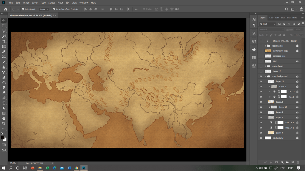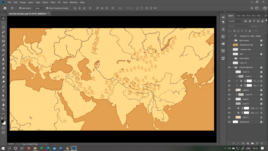 Next, the white space in every left page of the spread had a map of the civilisation. For these maps I found some free for commercial reuse maps online, and imported them into PSD, recoloring them to look brown, and adding texture to them again, giving the old paper effect. I then placed these in the InDesign document.