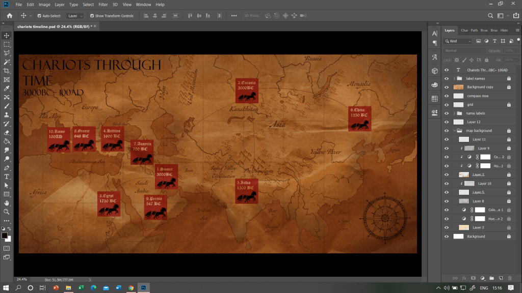A very interesting part of my process what is the timeline that I created. I realised that all the chariots that I was including in my booklet were restricted to a very specific area on the world map. And thus I found it pointless to use the stock world map. This is because the stock world map usually came as a full vector and editing it would mean I would have to use Illustrator and Photoshop back and forth.Looking at my Dell monitor I knew this was very tough to do. So I customised the entire map. I did this by first taking a pre-existing physical and political world map, and imported it on Procreate. I then used Procreate for creating outlines of continents, rivers, and places that I wanted included in my world map. This was then imported as a PSD file, and over to Photoshop, I used it for colouring these continents, colouring the background, adding texture, and labelling everything. This was a very interesting process, since I felt like I was creating a fantasy map for my game, and I was physically labelling every geographical aspect of the map. For this I also had to go ahead and find a free cartography font online. Then I looked up for a free compass rose and included that as a multiply layer in my PSD file as well. In Illustrator, I imported a chariot icon that I saw online. I did not want to use the entire icon, so I pen-tooled the part that I wanted to use and customized it according to my own needs. Taking this over to Photoshop, I added a rectangle around it, and created stickers for every civilisation. I place these stickers over the map where the civilisation and the chariot was located. Finally, I connected these using dotted lines to show some flow in the timeline. I also used a free textured kraft paper as an overlay onto this timeline layer, and this helped me bring out some texture in the timeline. For the font on the timeline, I used Felix Titling.