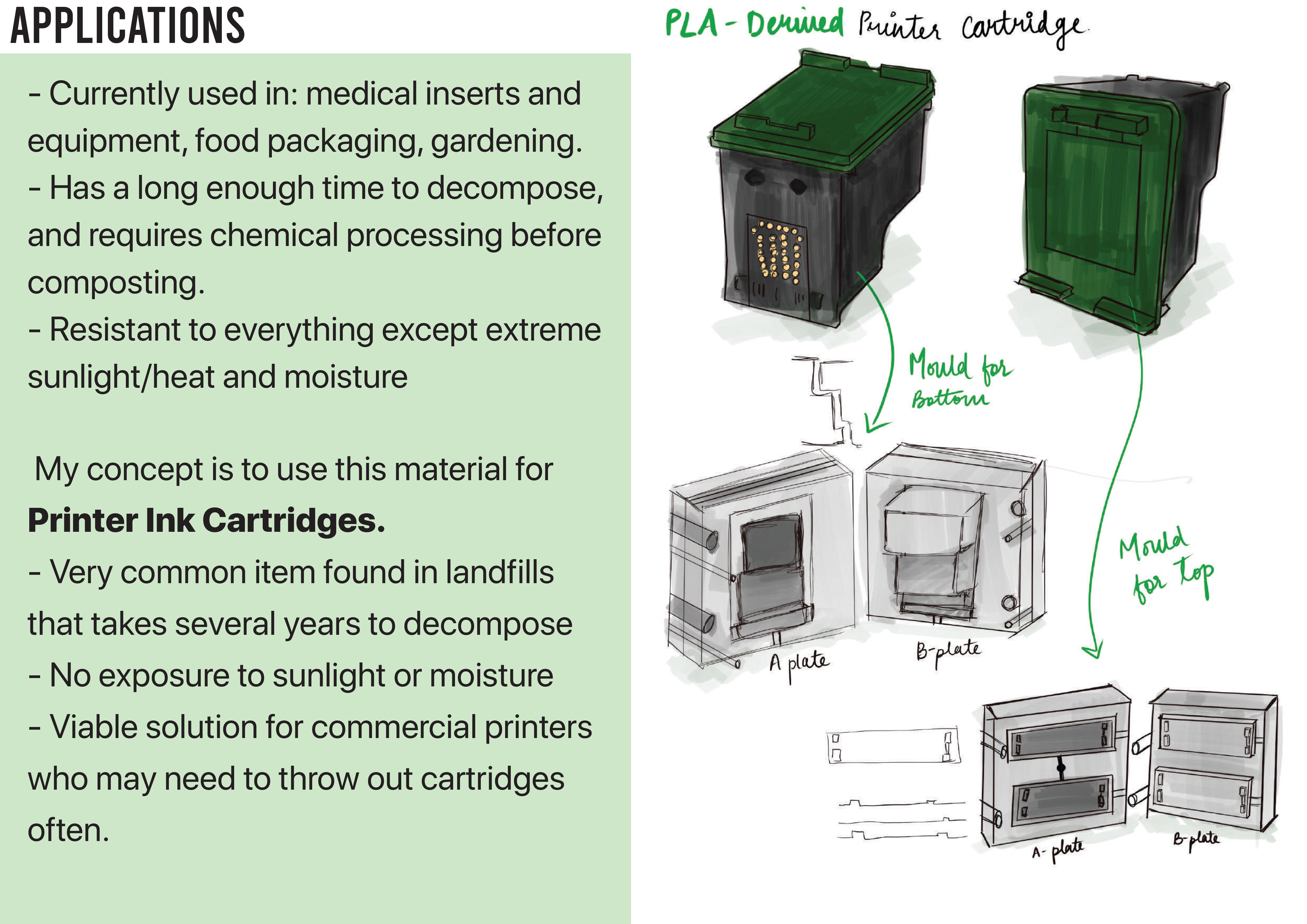 My second iteration was in relation to creating something out of PLA that can be used on the daily. For this, I searched up landfill pollution, and the common household items that usually occupy landfills. One interesting item that I found in this case was printer ink cartridges. Even though printer ink cartridges can be refilled, most people tend to throw them out after one or two uses. And commercial printer stores which use these have no option but to throw them away often after several uses. But these are still made out of regular HDPE. So a very good solution to this would be creating the printer cartridge out of PLA, since it has an ideal degradation time of around six months to a year, and this is the maximum time that a commercial printer would use a printer ink cartridge for.