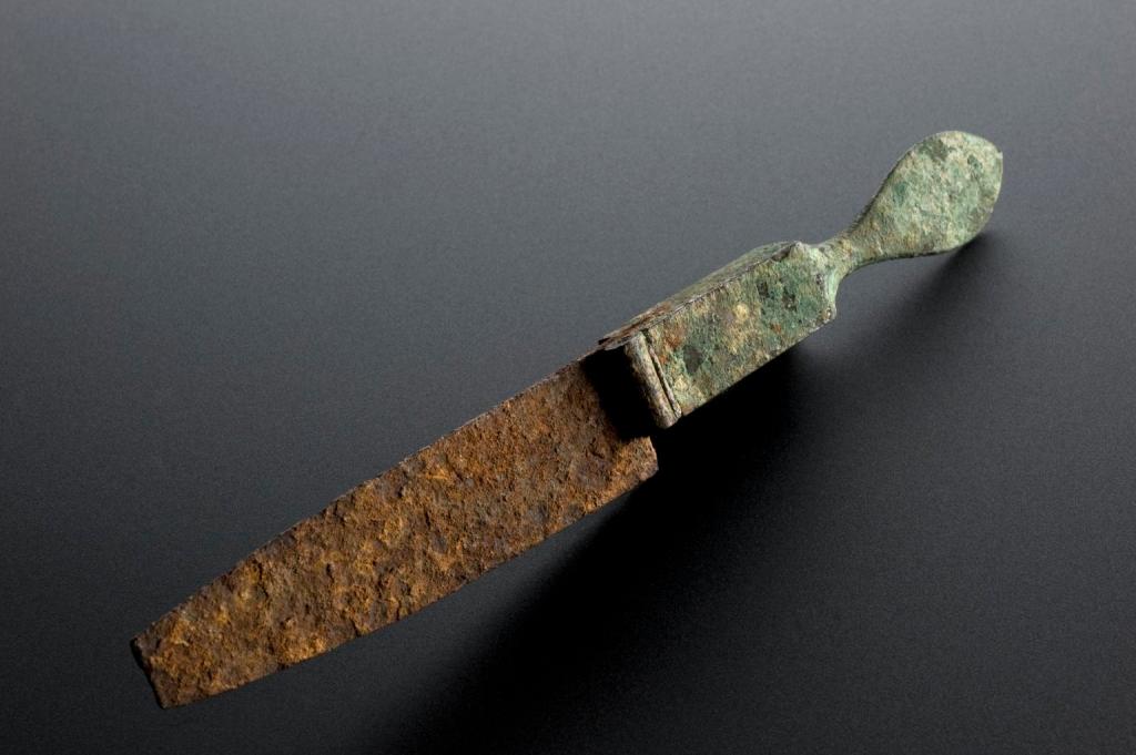 Knife, iron blade and bronze handle, Roman, found in Roman in 1932. Graduated matt black perspex background.