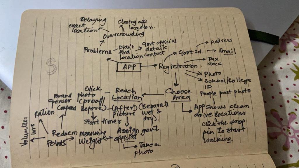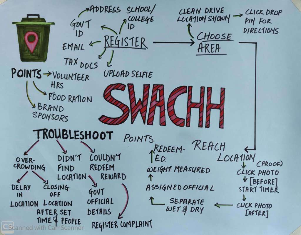 The app was a community service app meant for group initiatives to pick up waste. Mumbai is notorious for having heaps of garbage around every corner. This app would help tracking down these waste hotspots, connect people who live locally, and encourage them to pick up and segregate waste for an incentive. This incentive could be scholarships, coupon codes, wrations, etc. The person would be required to log in to this app with a registered govt id, and give their collection to the nearest Swachh centre, with a reward in return.